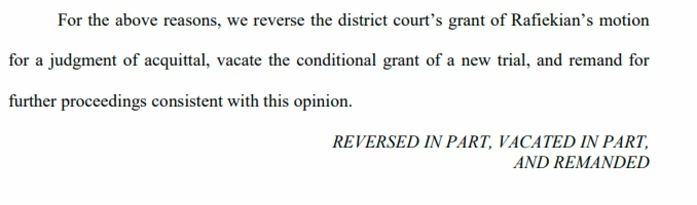Regarding the other conviction, that on the count of conspiracy to make willful and material false statements and omissions in a FARA filing, the district court judge opined there was no evidence of discussions or suggestions, let alone an agreement, to avoid filing under FARA or file a false FARA registration statement. The judge ultimately granted Rafiekian’s motion for acquittal and provided that if his decision were vacated or reversed by a higher court, a new trial would be warranted.