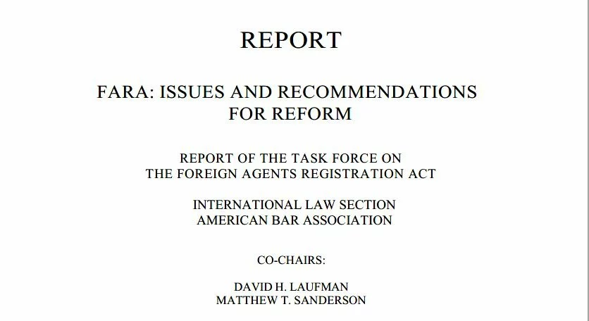 The American Bar Association created a task force on the Foreign Agents Registration Act (FARA) made up of attorneys who deal with FARA related matters and inquiries. Yesterday, that task force released the report "FARA: Issues and Recommendations for Reform" which outlines in 53 pages the reforms they say are needed to fix the law.